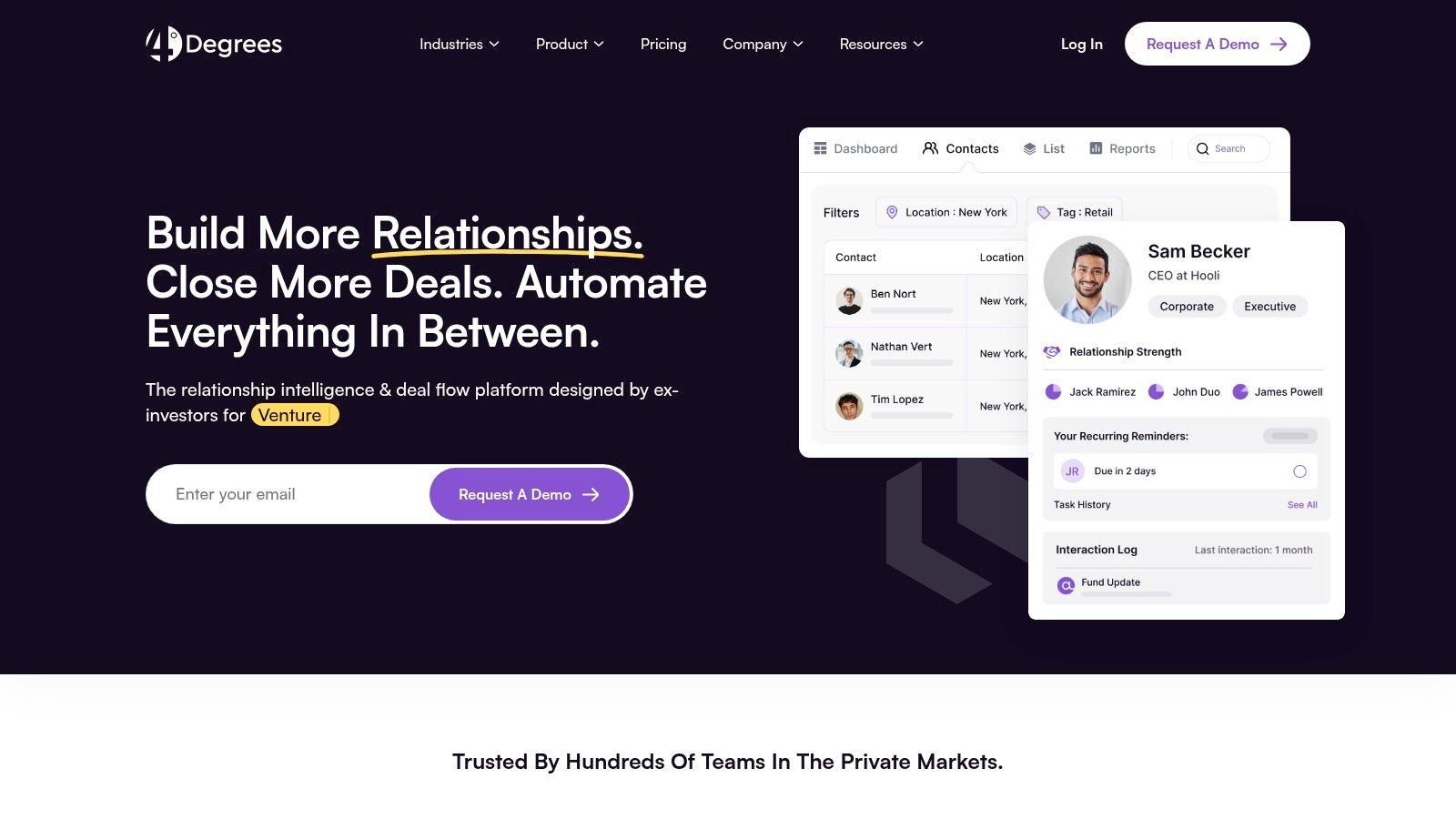 The system excels at reducing manual data entry by automatically capturing emails, meetings, and notes and linking them to the appropriate contacts or deals. This ensures that all relationship history is centralized and accessible, providing a complete picture of every interaction. Its automated workflows and nudges help teams stay on top of key relationships, ensuring no potential investor or partner falls through the cracks.