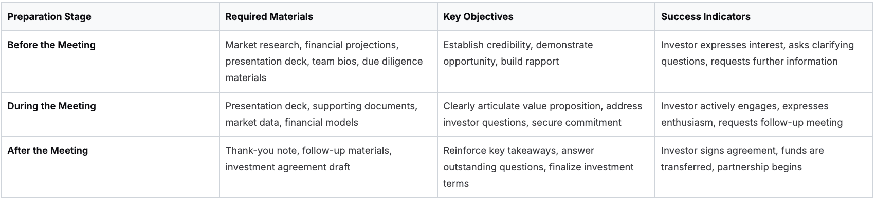 Before diving into your next investor meeting, review this checklist to ensure you're fully prepared. It covers essential items before, during, and after the meeting to maximize your chances of success.