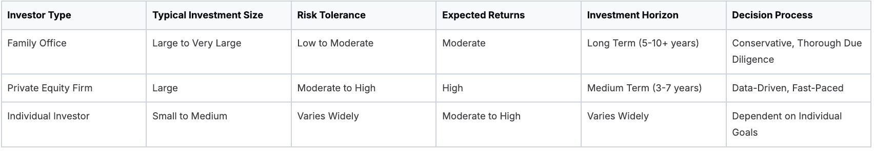 This table highlights some key differences between investor types. While family offices prioritize long-term, stable returns, private equity firms target higher returns over a shorter period. Individual investors exhibit a wide range of preferences across all categories.