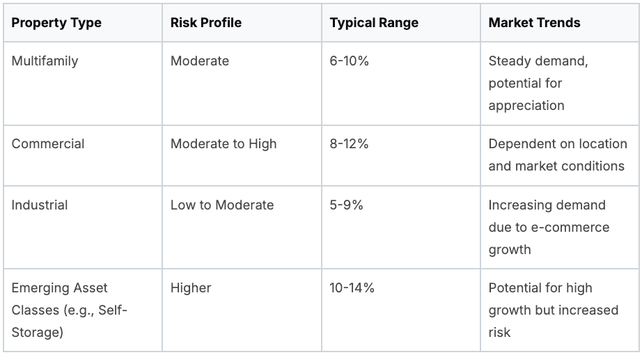 Investors should consider several interacting factors to evaluate preferred return structures effectively. This involves analyzing the property type, risk profile, and overall market trends. The following table offers a general overview of typical preferred return ranges for different real estate asset classes.