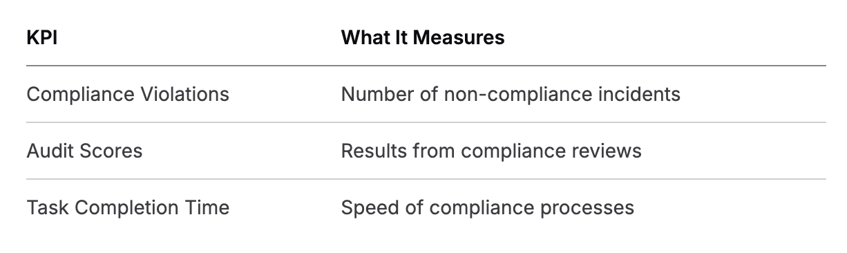 Track your compliance program's effectiveness using Key Performance Indicators (KPIs). These metrics help show the real impact of your compliance efforts, similar to measuring marketing results. Focus on key data points like violation numbers, audit performance, and task completion times.