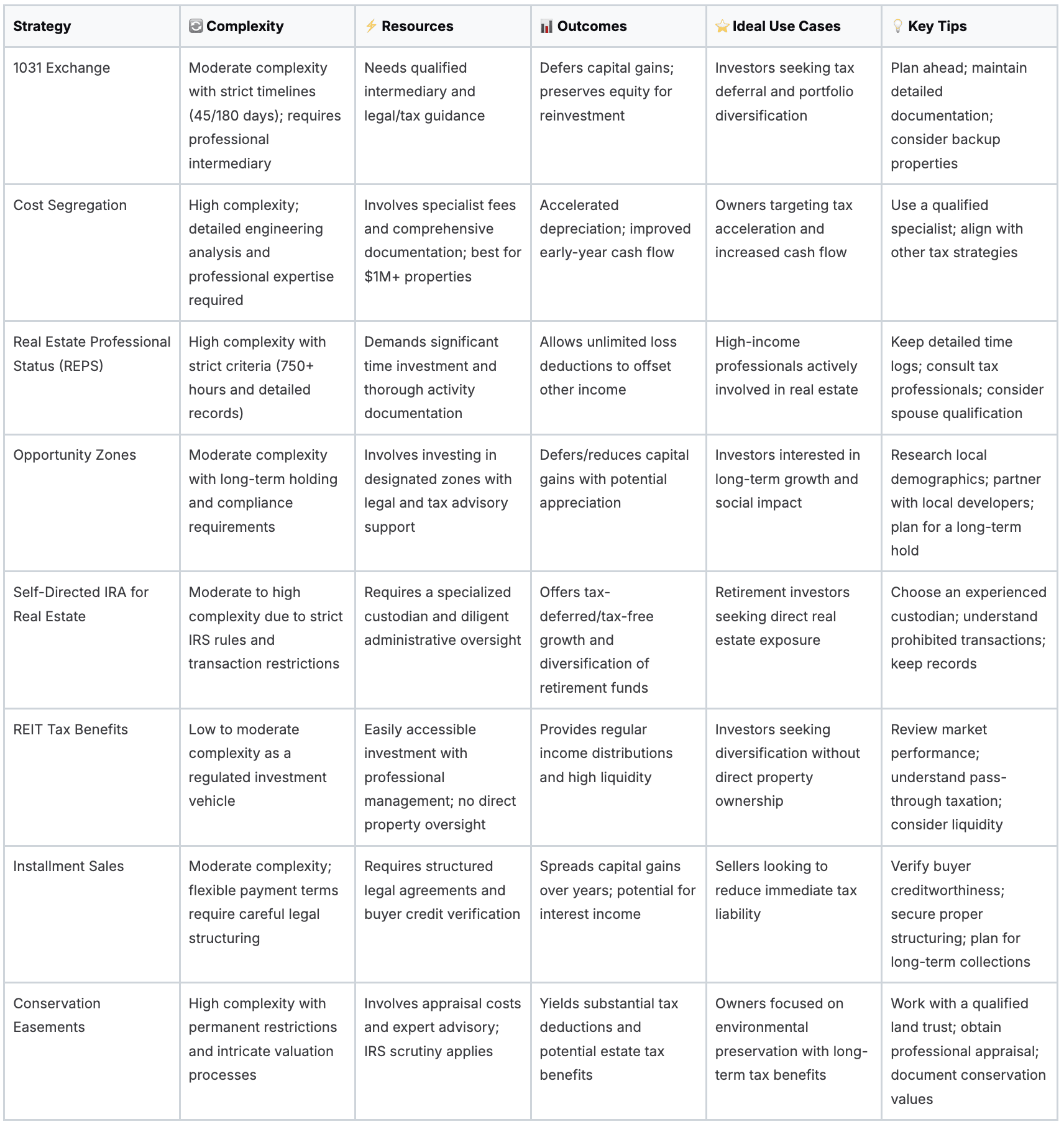 Smart real estate investors know that effective tax planning makes a big difference in investment returns. The eight key strategies we covered - 1031 Exchanges, Cost Segregation, Real Estate Professional Status (REPS), Opportunity Zones, Self-Directed IRAs, REIT benefits, Installment Sales, and Conservation Easements - can help reduce your tax burden when used properly. However, proper implementation is critical. Work with a qualified tax advisor to align these approaches with your specific portfolio and ensure you meet all requirements.