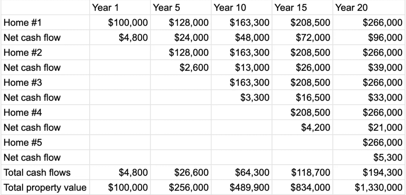 We’ll make the assumption that the investor pays all cash for the 1st property and purchases an additional rental property every 5 years. The 25% down payment of future properties is raised from a combination of cash out refinances and out of pocket personal savings. In addition, we’ll make the assumption that property prices increase an average of 5% per year, and that net cash flow is the money remaining after all operating expenses and mortgage payment has been paid. Lastly, we’ll assume that rent prices and operating expenses remain unchanged for the 20 year holding period.
